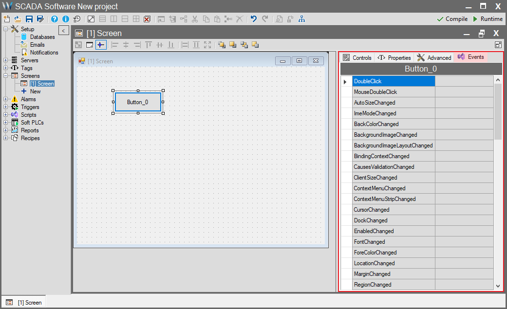 When you double-click an event from the list (e.g., Click or Load) or make a selection, the system automatically creates a script block for that event and redirects you directly to the Script Editor to write your code.