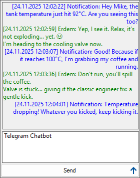 - Receiving Messages: When the external party (Telegram user) replies, their response appears in the chat window on the SCADA screen (displayed in the defined IncomingMessageColor).
