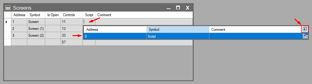 - Create New: Create a new script file by pressing the (+) icon and assign it to the screen.