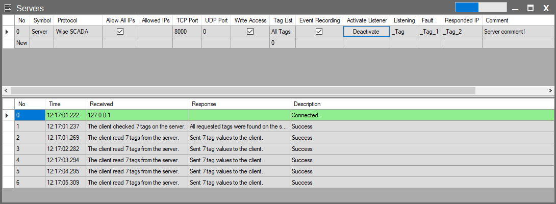 Responded IP(Status Indicator) Shows the IP address of the device currently connected to the server and exchanging data. A STRING type tag can be defined here.
