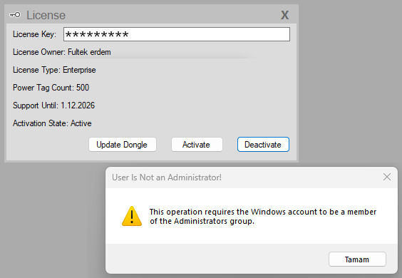 - If you confirm the prompt and allow the application to run with elevated privileges, the SCADA software will reopen with administrator rights, and you will be able to complete the license deactivation successfully.