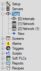 The Tags section in the project tree on the left is the main area where you manage all data points and connection protocols. All data sources in your project are displayed in a hierarchical tree structure under the “Tags” heading. Every newly added protocol (Network) is added to the list with a default name (e.g., Network, Network (1)). Recommendation: To prevent confusion, change these names to match your specific device or process (e.g., Packing_Line).