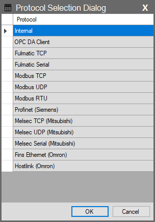 | Protocol | Specifies the type of communication driver used (e.g., Fulmatic TCP, Modbus RTU, Profinet). |