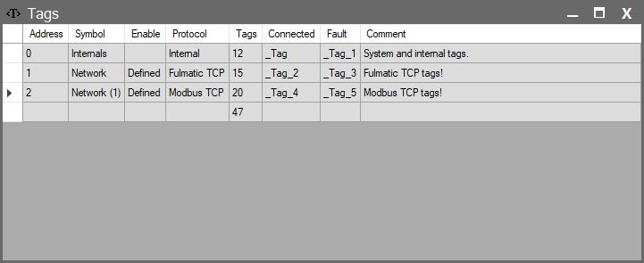 When the Tags heading is selected in the project tree on the left, the right panel lists all communication protocols (Networks) added to your project. This list summarizes all connection points between your system and the outside world (PLCs, devices) as well as its internal structure (Internal). Each row represents an independent driver and is managed via the following parameters: