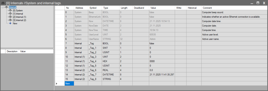 • When you click the top [0] Internal heading in the tree structure, all internal tags under the hierarchy (both System and user-defined groups) are displayed as a single list in the panel on the right.