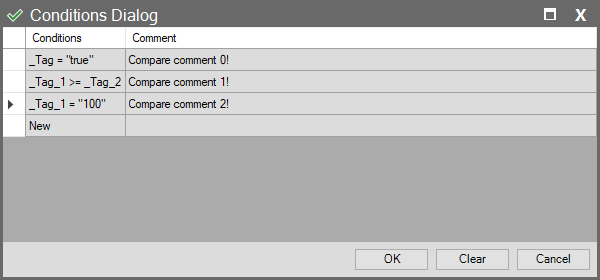 You define a condition in each row. Open the Compare Dialog window by clicking the + New option to create a new condition or by double-clicking an existing row.