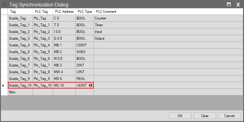 - Result: As long as this red exclamation mark exists on any row in the window, changes will not be saved, even if you press the “OK” button. To successfully synchronize, this error must be corrected first (by selecting the appropriate data type or address).